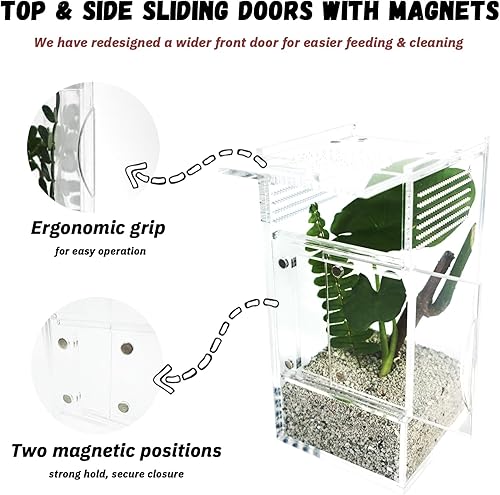 DUAL DOORS WITH MAGNETIC LOCK: Now featuring a wider front door based on customer suggestion. Dual sliding doors for easy feeding and cleaning. Front door protects delicate spider webs, while top-opening door allows easy access without disturbances