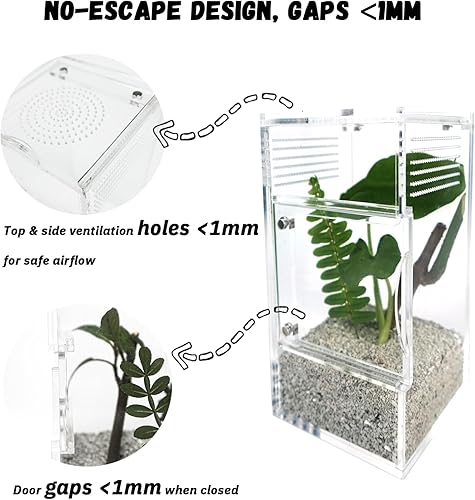 SMARTER VENTILATION DESIGN: The jumping spider terrarium features redesigned ventilation holes and door gaps (≤1mm), preventing escapes while ensuring proper airflow. Unlike generic bug terrariums, our enclosure keeps even the tiniest spiders secure
