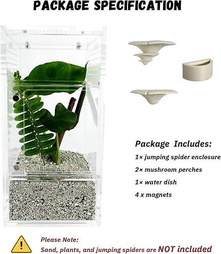 Included Components: 1× jumping spider enclosure, 1× water dish, 2× mushroom perches