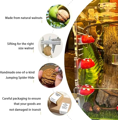 Jumping Spider Enclosure: Our Jumping Spider Hide features a strong neodymium magnet, the Hide uses a bolt/nut combo instead of a glued on magnet to make sure there are no accidental falls.The jumping spider hideout is handmade from natural Walnut shell, well crafted and made from natural materials,Make your jumping spider feel comfortable and safe, and it is convenient for you to observe your jumping spider.