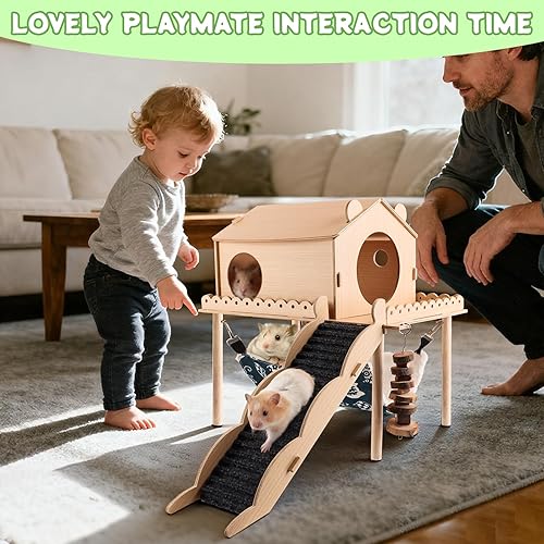 Premium Quality: Kalolary Wooden Guinea Pig Castle made with natural wood. The Guinea Pig Hideout house comes with a wooden play structure, allowing hamsters to safely play, run, and jump inside, enhancing the happiness and joy of hamsters and other small pets.
