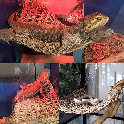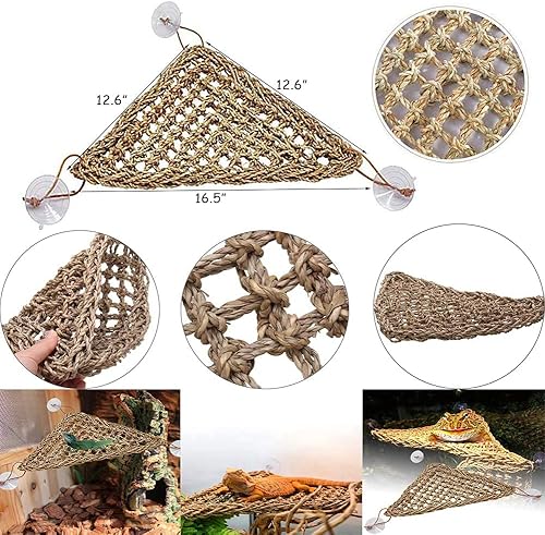[NATURAL MATERIALS&HANDMADE] Hammock bed is made of natural seagrass. All by hand woven, seagrass fiber material, soft but very sturdy and durable,dragons will enjoy using the lounger to rub on when they are shedding their skin.Comfortable and climbable lounger that all pet reptiles will enjoy.They use it for jumping on and off, climbing, hanging and sleeping. It provides an elevated vantage spot that most reptiles will enjoy