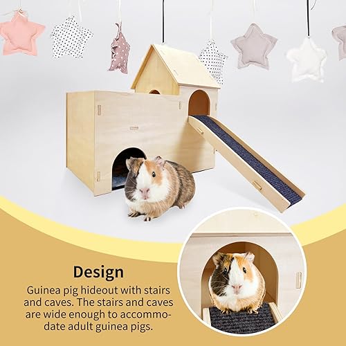 With Stairs: Guinea pig hut has a removable ramp for easy access to the first floor for small pets , the ground floor has plenty of space for them to hide, and also features a bottomless design for easy cleaning of the interior and changing bedding