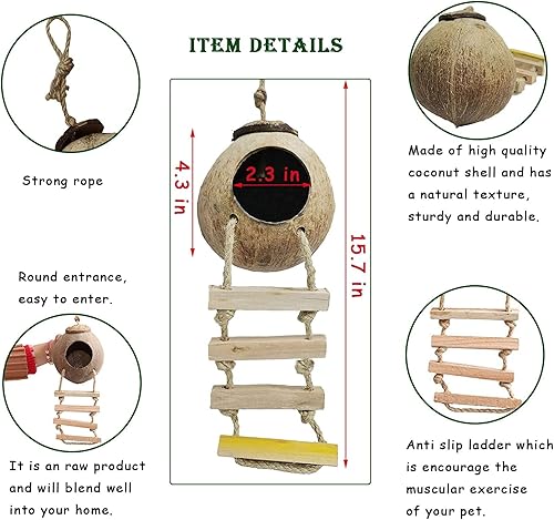 Package Include: You will get a coconut shell with a ladder, a coconut shell nest, a coconut shell with multiple holes, two flexible vines of different colors, a reptile leaves, twelve suction cups