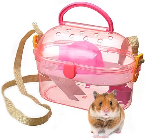 【Portable Hamster Cage】This hamster travel cage comes with an adjustable strap, making it convenient to carry and providing maximum comfort for you and your pet. Additionally, it is designed with a practical handle, allowing you to choose to carry it by hand. Moreover, the set includes the hut, stairs and food bowl.