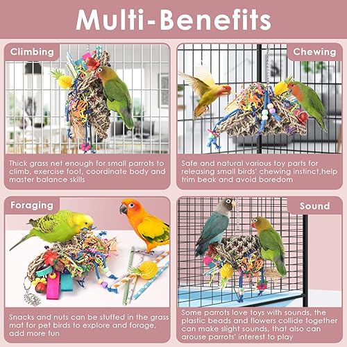 ENCOURAGE INSTINCTS: Parakeet foraging toys can meet parrots' daily needs for shredding, foraging, preening and climbing. With vivid colors and crisp bells easily attracting pet birds' attention, encourage them to climb and nibble for keeping health