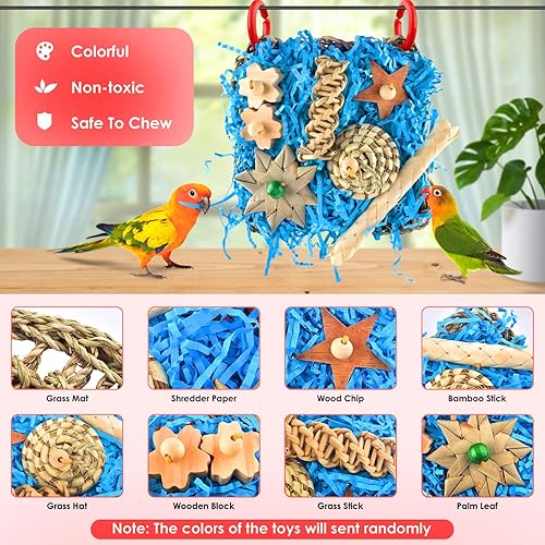 ENCOURAGE NATURAL BEHAVIORS: Shredding, foraging, preening and climbing are birds' instincts. KATUMO exclusively designed parrot chew toys will meet small birds' daily needs, with vivid colors can easily attract all types of pet birds' attention, encourage their ability to climb and nibbles