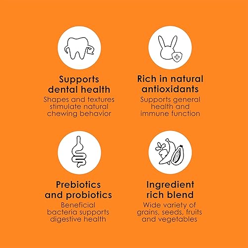 SUPPORTS DENTAL HEALTH with a variety of shapes and textures, encouraging chewing activity.