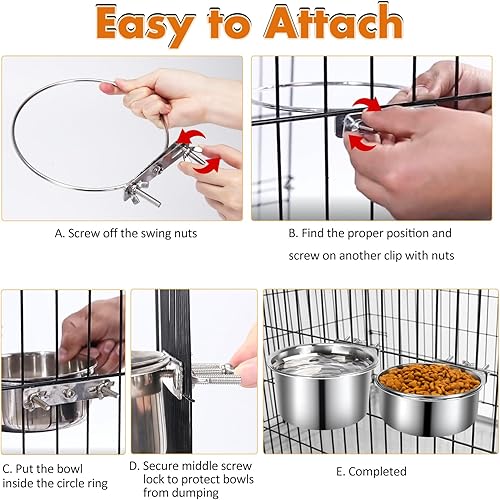 No Spill & Keep Crate Neat- The metal dog bowl fit snugly into the place supported by the ring to avoid spilling over to keep the kennel clean, and we upgrade 3 wings screw design to keep the bowl fixed without wobbling to avoid your naughty fur babies flip his food and water dish over from the bottom.