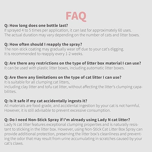 Effortless Litter Maintenance: Say goodbye to the hassle of scraping and scrubbing. Lady N Non-Stick Spray creates a protective coating in just 4 easy steps, preventing litter from sticking to the bottom and sides of the box, and ensuring a quick and efficient clean-up.
