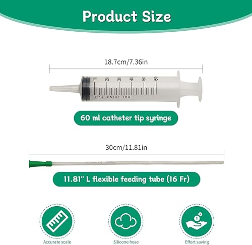 Includes 1 x 60ml syringe, and 2 x 12''L flexible clear plastic feeding tubes (16fr)