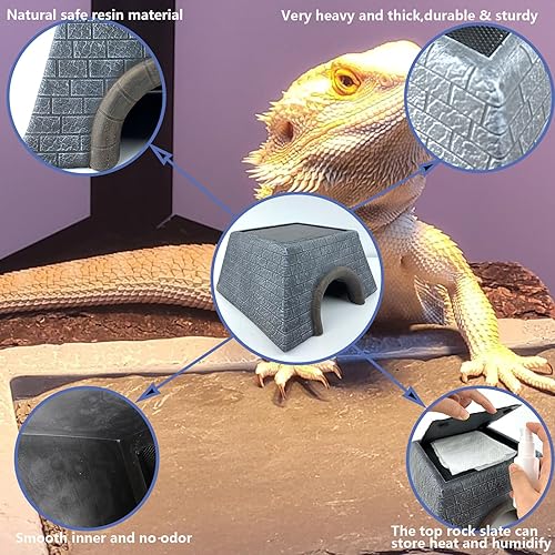 Storing Heat & Maintaining Cave Humidity: Reptile rocks hide cave with a natural slate stone area at the top that mimics nature by absorbing heat from sunbathing bulbs and releasing it under infrared radiation.You can also put wet wipes under the stone slate to add cave humidity to meet the lizard's needs
