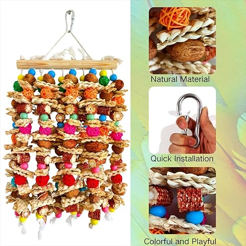 NATURAL MATERIALS: Handmade big bird toys with corn husk, walnut shells, and corn cob – safe for birds to shred and chew. No dyes/chemicals, satisfying natural beak-trimming instincts and preventing overgrown beaks.