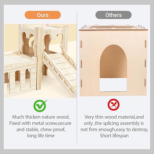 【Natural Thicken Wooden Rabbit Hideout - Spacious & Secure】Crafted from 100% natural solid wood, this charming bunny castle offers a safe and stimulating retreat for your rabbits, guinea pigs, and other small pets. Its strong structure features smooth, double-sanded edges and rounded corners to protect delicate paws-making it both a fun and safe hideaway.