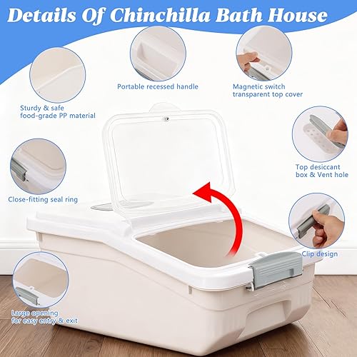 Portable & Easy to Use: Equipped with bottom rollers and ergonomic recessed handles, the chinchilla sand bath box is easy to move even when filled with bath sand. The magnetic transparent sand bath cover can be opened with one hand, or you can simply remove the top cover for easier cleaning, sand replacement, and daily pet care