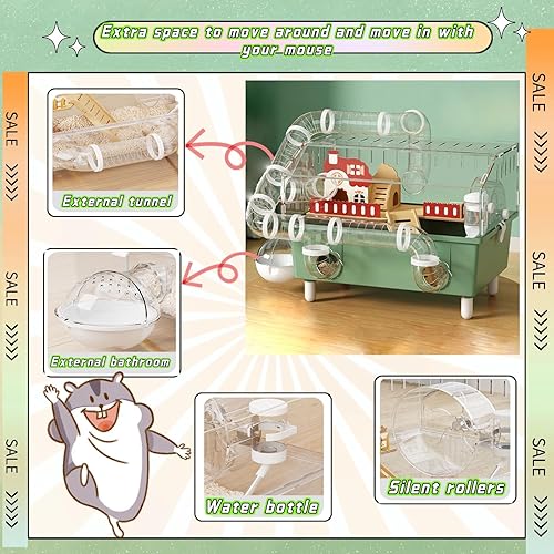 Multi-Storey Design with Extended Tubes 17.7"x11.8"x13" hamster cage features interconnected tunnels for climbing and play. Ideal for dwarf hamsters, gerbils, or mice seeking adventure. Durable acrylic structure balances beauty and practicality, offering vertical space for small animal habitats.