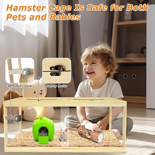 Safe for hamsters: Our large hamster cage is made with thickened solid wood materials to ensure stability and durability. It is equipped with bronze locks for the wire mesh windows and double child safety locks on the sliding door, ensuring extra safety and preventing pet escapes. These safety features make it suitable for households with babies and other pets. Choose Nalwort, the preferred choice for hamster happiness