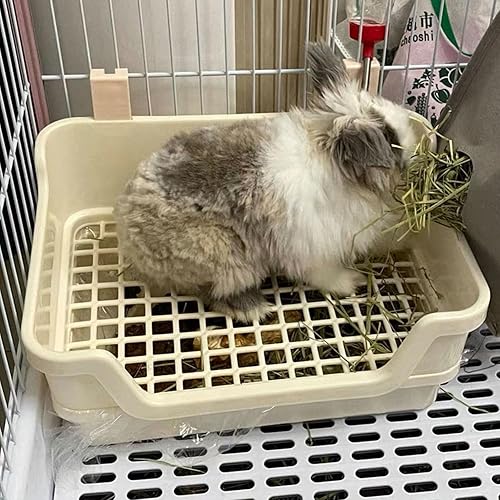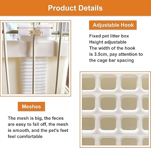 Rabbit Toilet features a smart design with detachable top and bottom for easy cleaning and replacement of pad materials, three sides fence to prevent urine splashes, and adjustable hooks for secure attachment to most rabbit cages