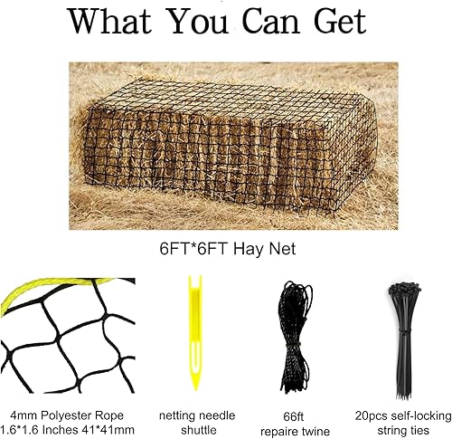 Long-last & Thick Hay Net: Durable slow feed horses hay nets are made of the permium quality rope (4mm diameter), which is strong and can bear up to 2200 lbs. You can get 1 bag 6x6ft hay net, 1*netting needle shuttle, 1*66ft repaire twine, 20pcs self-locking string ties and life-time after services.