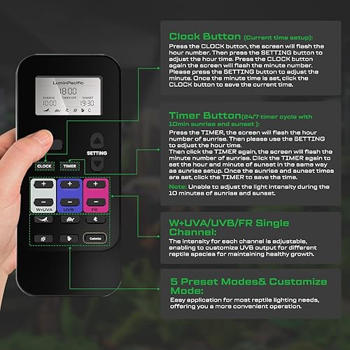 LCD Remote Control: The LuminPacific UVB reptile light comes with an LCD display remote control that allows for precise lighting control. You can set daily sunrises and sunsets with a 10-minute ramp-up/down, and independently adjust UVB, UVA, and FR light brightness with 10 levels for a customized reptile habitat.