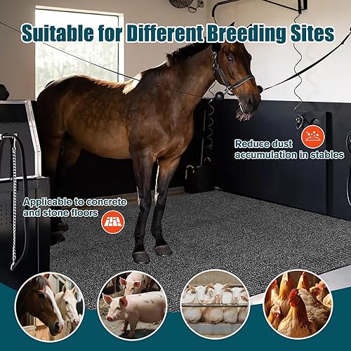 Thick and Large Size:This stable mat measures 4 x 6 feet and is 6 mm thick, providing ample coverage to reduce wear and tear on stable floors. The thickened design cushions pressure on the hooves, making it more comfortable for horses to stand on, and it is resistant to deformation even with long-term use