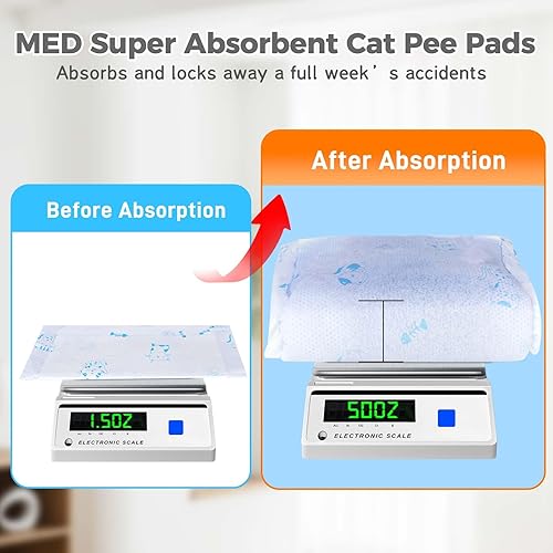 Maximum Absorbency: MED cat pee pad features a high-absorption core that locks away up to 7 cups of liquid—enough for a full week of use for one cat, keeping the litter box dry, clean, and hassle-free