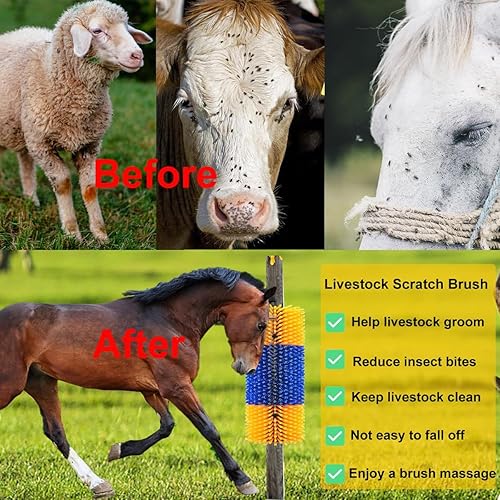 【Durable & Weather-Resistant for Outdoor Installation】Designed for use in barns, paddocks, and pastures, this livestock scratching post comes with rust-resistant screws, ensuring long-lasting durability. The cow brush and cattle scratching post can withstand heavy scratching and rough use.