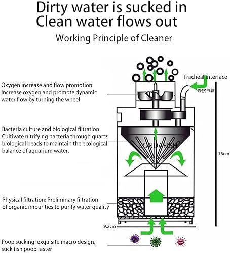 HOW IT WORKS:Purify the water in the fish tank, store fish manure and impurities in the intermediate compartment, suck up the dirty water, and then return the clean water to the water tank. If your fish is too small, please pay attention when using it and prevent the product from sucking the small fry in the working process.
