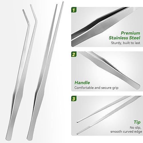 【More Universal Usage 】- These long tweezers are aslo widely applied to kitchens, gardening, and home. Extra long tweezers can be used for cooking, jewelry making, repairs, crafts, gardening and more. You will get one straight tweezer and one curved tweezer