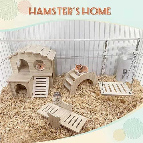 These hamster toys are made of quality wood board, which is waterproof and sturdy, Non-toxic paint, safe for animals and without any chemiacl treatments.