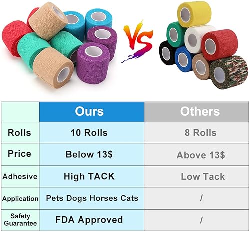 ASSORTED VET WRAP TAPE: Totally 10 self-adhering bandage tapes, 2 red + 2 blue + 2 purple + 2 tan + 2 green offers great fun for decorating