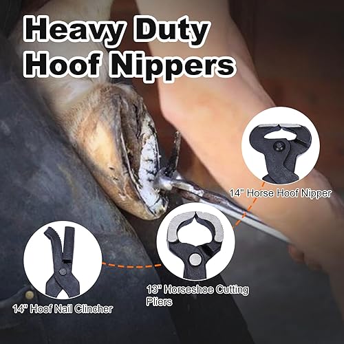12PCS Horse Farrier Tools Kit : 1 x 14-inch Horse Hoof Nipper, 1 x 13-inch Horseshoe Cutting Pliers, 1 x 14-inch Horse Hoof Nail Clincher, 1x7-inch Goat Hoof Trimmers Shear, 1 x Horsenail Hammer, 2 x Horse Hoof Knives, 1 x Horseshoe Rasp File+Handle,1 x Horseshoe Brush (color random),1 x Handbag, 1 pair of Gloves