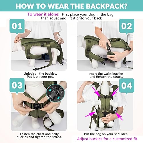 【EASY TO WEAR AND USE】 --- The dog carrier backpack is easy to put on and take off with buckles securing the front chest, side legs and owner's waist. Undo the buckle, place your pet's limbs and tail in the appropriate positions, put them on, fasten the safety buckle and adjust the straps for a perfect fit.
