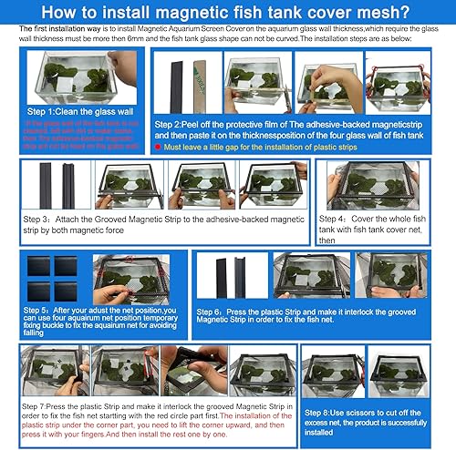 DIY Magnetic aquarium anti-jumping net cover mesh contains:13.12 feet long adhesive-backed magnetic strip,13.12 feet long grooved magnetic strip,13.12 feet long plastic strip,4 units fish tank corner buckle and 4.92 feet length X 3.28 feet width size aquarium cover net.