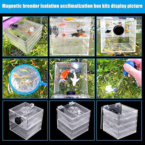 【Aquarium baby fish breeder box for fish tank product kits list】1pcs 4.72 Inch*4.72 Inch*4.72 Inch High Quality acrylic magnetic fish tank aquarium breeder box with 3pcs Freely Assembled Isolation board(The main boby of fish breeding hatchery box is molded in one piece and you do not need to assemble the main body of the breeder box), 1pcs 7.6 Inch Guppy Baby Fry Net, 1pcs 8 Inch Fish Feeder