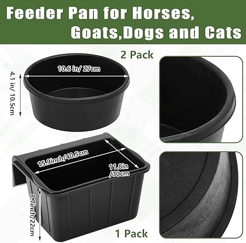Comprehensive Feeding Solution: combine efficiency with versatility via the rubber feed pan and horse feed bucket set, which includes a 17-Quart over the fence feeder and two 4-Quart feed fans; Designed to meet the needs of families managing multiple pets or caring for larger animals, this set supports efficient feeding in varied environments