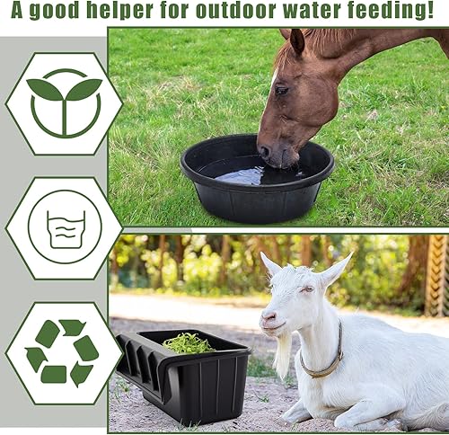 Built to Withstand Diverse Conditions: adaptable for both indoor and outdoor use, the rubber feed pan and horse feed bucket withstand low temperatures, making them suitable for medium-sized animals like horses, dogs, chickens, ducks, or goats; Their rubber construction ensures resistance to cracking and crushing
