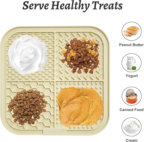 75 Strong Suction Cups & 4-Quadrant Design: The licking mat for dogs large and cat lick mat with 75 suction cups can stick to any glossy surface, such as ceramic tile, floors, glass, bathtubs, and fridges. Four different textured areas are spreadable for all kinds of dog foods, like peanut butter, yogurt, and cream cheese. It's better to put the dog lick pad on a towel to spread the treat mixture rather than place it on the kitchen counter so as to avoid food splashing when picking it up