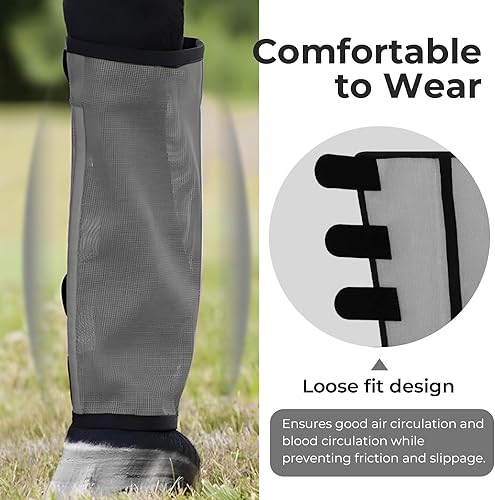 Breathable and loose fitting design:horse fly boots are made of breathable and sturdy plastic mesh, which is worn without binding and ensures vital ventilation and breathability, perfect for flies or hot seasons. The loose fitting design allows for good air circulation and blood flow without chafing or shedding.