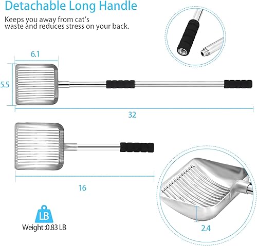 METAL CAT LITTER SCOOP - This cat litter scoop is made of aluminum alloy and the pole is made of stainless steel, which is not only perfectly shaped, but also reaches deep into the corners. The cat litter scoop comes with a soft foam handle for comfortable use and is designed for use with heavy-duty cat litter scoops