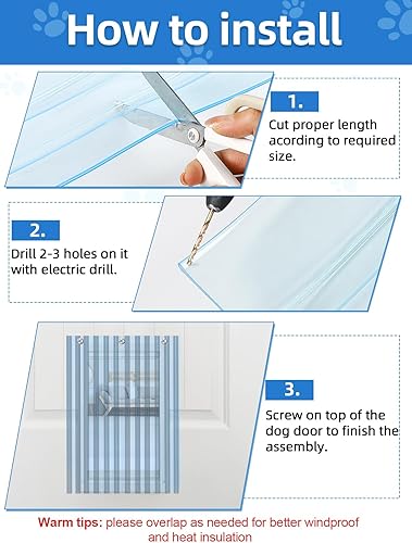 EASY TO USE: First, you need to cut plastic vinyl strip for dog entry door according to the desired size, then drill 2-3 holes on it with electric drill, and finally screw on top of the dog door to finish the assembly. Note, for better windproof insulation, please overlap 0.04in.
