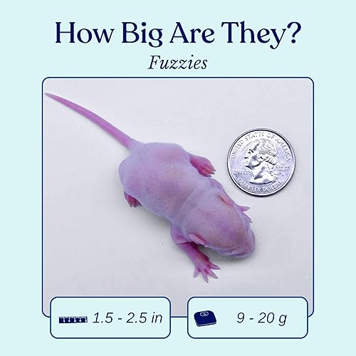 Size; this frozen pack of 15 count frozen rat fuzzies are 2-2.5 inches long not including the tail and 9-19.99 grams each
