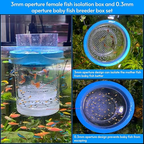 【Efficient fish breeding function】The isolation box with 3mm mesh can separates the mother fish from the baby fish and prevents the baby fish from being eaten by mother fish. The 0.3mm mesh aquarium breeding box can prevents the baby fish from escaping breeding box and avoid being eaten by other large fish in the aquarium.