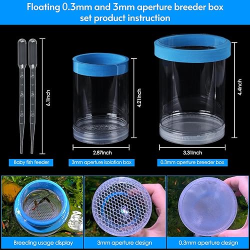 【Fish Breeder For Fish Tank Product Kits List】Our fish breeder box includes 1pcs 3mm mesh innner breeder box with 2.87 inches in diameter, 4.21 inches in height ;1pcs 0.3mm mesh outer breeder box with 3.31 inches in diameter, 4.4 inches in height;2pcs 6.1 Inch baby fish feeder