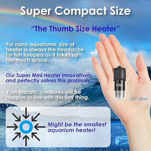 SUPER MINI SIZE – This mini fish tank heater is just about the size of a thumb – only 1.97”(5cm) long. It's fantastic for nano tanks/betta tanks. The groundbreaking super tiny design brilliantly addresses the fish keepers' annoyance with traditional heaters! Occupies less space, easy to tuck away, but packs a punch in power! Temperature ranges between 64-93F, suitable for tanks up to 1 gallon.