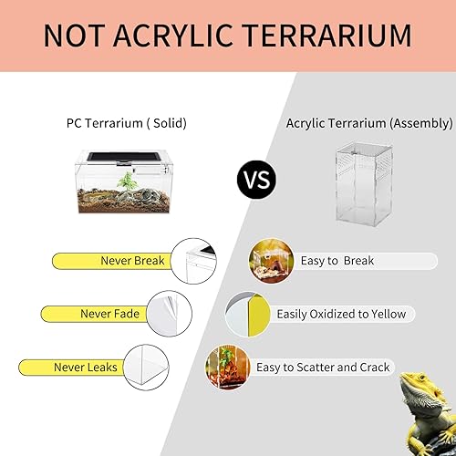 ✅【Clear Crystal Explosion Proof PC with 360 Degree full View】Made with high quality thick and extremely high hardness crystal explosion proof PC base for more safety. The biggest feature of this terrarium tank is that it is explosion-proof and anti-drop, with a brightness of more than 98%, and it will not yellow after long-term use. The temperature of this reptile tank can withstand -20 °C to 120 °C. An ideal habitat for desert-dwelling animals.
