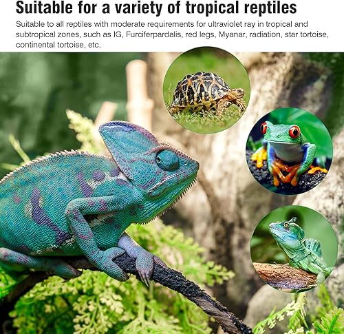 Perfectly Tropical UVA UVB Reptile Light: Illuminate with precision. Delivering 5% UVB and 30% UVA without harmful UVC, it caters to your reptile's lighting needs. And, with its universal E26 base, setup is a breeze in any standard reptile fixture.