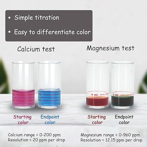 Ca range from 0 – 200 part per million (ppm) with the resolution of 20 ppm per drop. Mg range from 0 – 960 ppm with the resolution of 12.15 ppm per drop