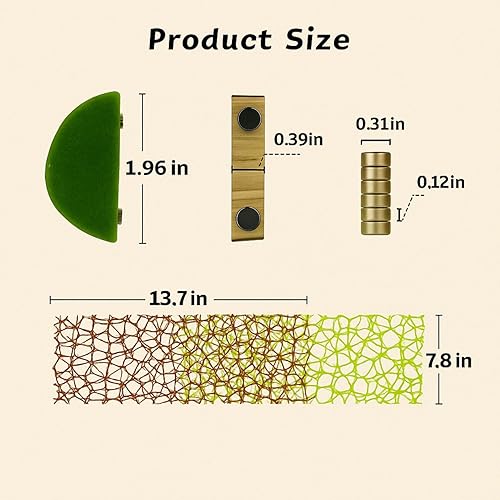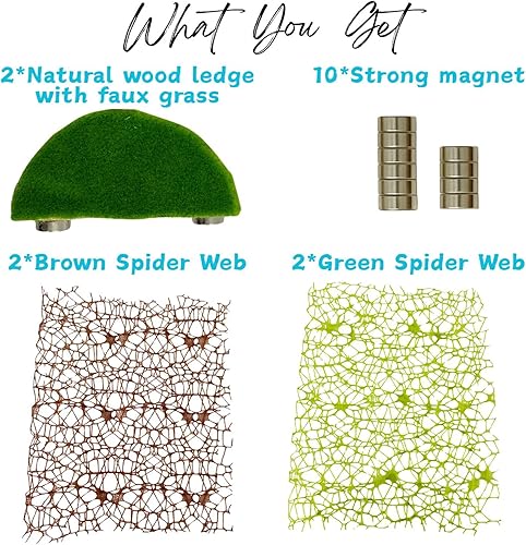 【Multi-Functional Décor Set】This versatile jumping spider enclosure accessory includes 2 natural pine wood ledge, 2 wood ledge with faux grass, 4 polyester climbing web (2 brown and 2 green), and a hemp rope bridge. Ideal for encouraging climbing, hiding, and resting in a fantastic environment.
