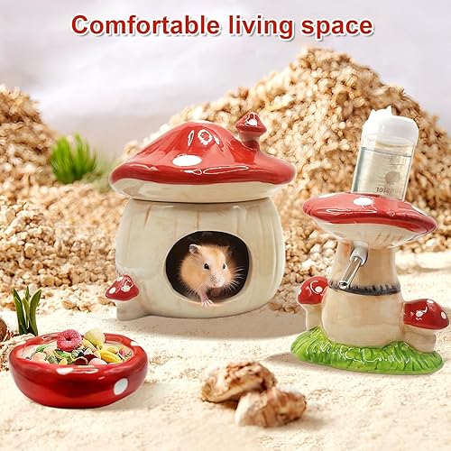 Versatile Accessories: Includes a ceramic mushroom hideout, water bottle with stand, food bowl, and other essential supplies for your hamster's habitat.
